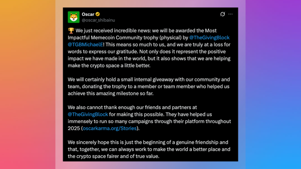 Oscar’s got news that’s got the pack buzzing. They’re taking home the Most Impactful Memecoin Community award from The Giving Block.